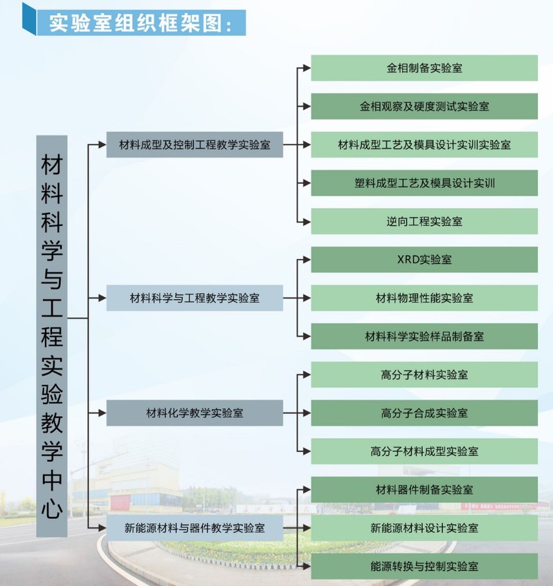 材料科学与工程实验教学中心设有材料成型及控制工程教学实验室、材料科学与工程教学实验室、材料化学教学实验室、新能源材料与器件教学实验室等教学实验室,现有实验管理岗5人,实验课程教师20余人,为员工开展材料科学与工程实验、实训和科研训练提供了平台和支撑条件,能够较好地满足应用型人才培养需求。