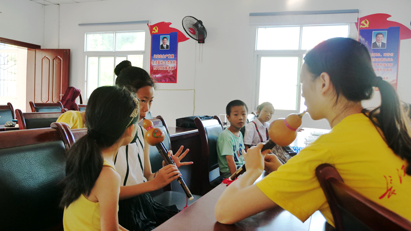 为此,志愿者们专门成立了多样行的辅导班,并提前做了广泛的宣传,希望能为石牛村的小朋友带来一些帮助。17日早上八点,石牛村的孩子们准时来到了村委会的会议室,孩子们对知识渴求的眼神令志愿者们充满了感动,于是,志愿者们也以无私的关爱,尽心的辅导来回报孩子们的拳拳赤诚。在会议室里,有饶有兴趣学着“葫芦丝”的小朋友,也有拿着暑假作业虚心请教志愿者的六年级小弟弟,还有着虚心向志愿者求教英语学习技巧的初三小妹妹,而我们的志愿者也是充满了耐心,仔细的解答孩子们的每一个问题。在这间小小的会议室里,朗朗的读书声,和着歌声越飘越远。