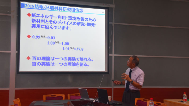 鲁云教授先是详细地介绍了他所工作的大学―千叶大学,并欢迎大家去千叶大学学习。之后,鲁云教授首先以“新型热电材料探索之一―Ni-Al系豪斯勒合金”为题作了精彩的报告,随后,各学院各老师依次与鲁云教授作了项目对接。