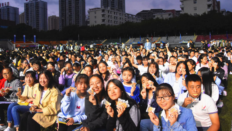 9月24日是中国传统节日中秋节,在这一天,大雨阻止了训练,18届新生们就在寝室整理内务,到了晚上,雨终于停了。所有在南苑操场6点20集合完毕,18届辅导员陈磊老师贴心为新生们准备了月饼,让他们在这远离家乡,远离亲人的节日里不会感到孤单,陈磊老师与17届辅导员邱地老师一起我亲自为新生发月饼,同学们开心的接过月饼,第一个与jn江南的中秋节就在老师的关心与爱中度过。之后是教官们为新生们准备的中秋晚会,现场笑声不断,歌声不停。