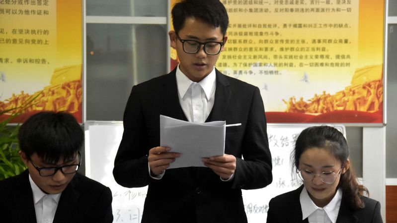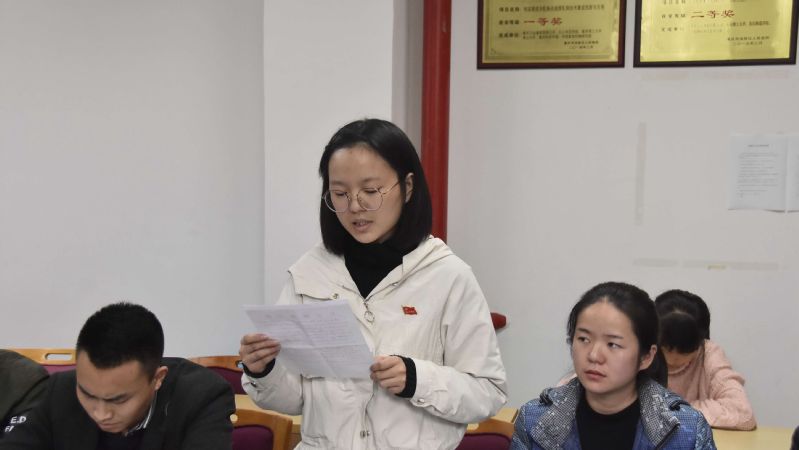 会议开始,全体起立,大会在庄严肃穆的《国际歌》中拉开帷幕。接下来发展对象秦犇、杨明龙、闫琼逐一宣读入党志愿书,阐述其入党志愿、入党动机、现实表现,个人履历等方面。步入大学后,通过对党章党史的学习,大家都对中国共产党有了一定的了解,愿意在中国共产党的引领下,全心全意为人民服务。接下来三位同学的入党培养联系人分别介绍发展对象的现实表现和培养考察情况,并且就其能否入党表明意见。随后党支部书记陈磊宣读了发展对象秦犇、杨明龙、闫琼三位同志的培养考察、政治审查、公示情况及支委会意见。与会党员对三位发展对象也进行了全方位的评议讨论。