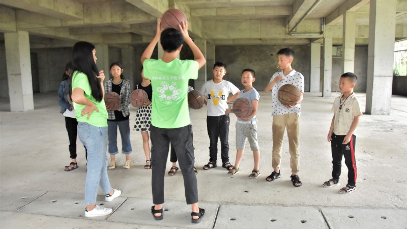 高年级孩子在地下车库排练的篮球秀节目。志愿者付成云和周泳玲挑选出五名男生和一名女生来组成表演队伍。表演内容包括运球、传球、胯下拍球等一系列动作。志愿者与孩子一对一的练习锻炼了孩子们的动作技术,培养了他们的团队合作精神。两个小时的练习后,志愿者和孩子们都留下了汗水,衣服上沾满了灰尘,表演节目有了大致的雏形,志愿者和孩子们便由衷地露出满意的笑容。