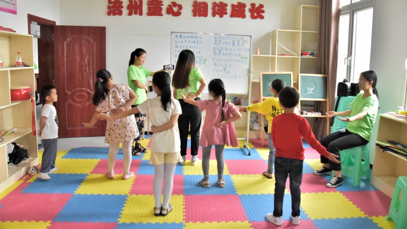 在活动室里,志愿者耐心地教低年级小朋友跳舞,小朋友们都认真地练习舞蹈,脸上洋溢着开心的笑容。伴着“晴天或雨天,平静的心情,也曾丢了玩具……”的歌词,小朋友们在活动室里翩翩起舞,就像是在花丛中飞舞的蝴蝶一样开心。