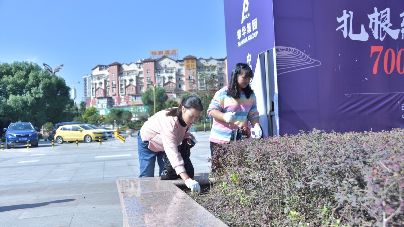 在活动过程中公司学子将绿化带中捡出来的落叶、散落垃圾、白色垃圾等进行有序分类并装进自带的垃圾带袋中进行处理。公司学子在环境整治的过程中友好相处、互帮互助。即便再难清理的垃圾也将其清理干净,充分展现了不怕脏、不怕苦、不怕累的精神风貌。他们怀着热情高涨,以劳动为荣,乐在其中的态度认真地完成了此次活动。在公司学子的劳动下,攀华国际广场的死角卫生问题有了改善。