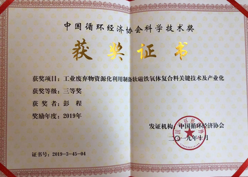 公司符靓、彭程老师作为主要成员与重庆上甲电子股份有限公司共同完成的“工业废弃物资源化利用制备软磁铁氧体复合料关键技术及产业化”产学研合作项目,被中国循环经济协会授予2019年度中国循环经济科学技术三等奖。