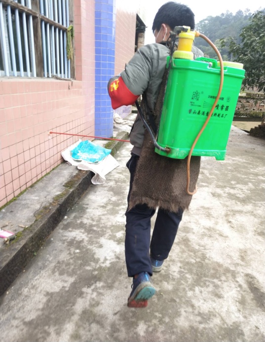 (志愿者杨明龙为每家每户进行消毒)
