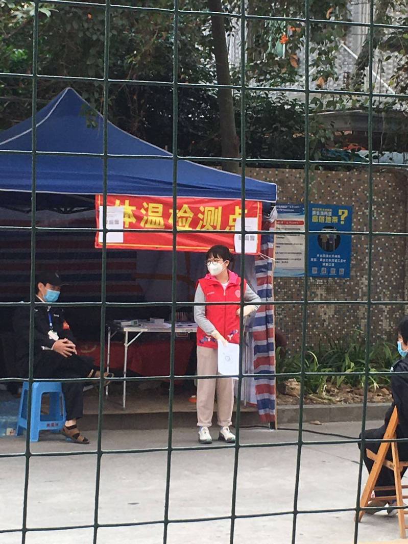 (志愿者陈佩瑶在深圳市龙岗区龙城街道吉祥社区路口进行排查)