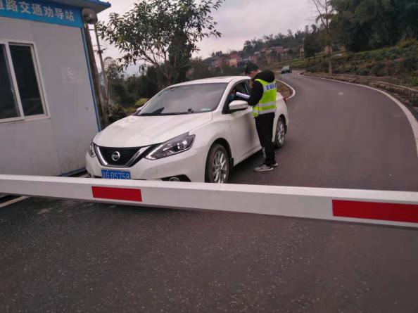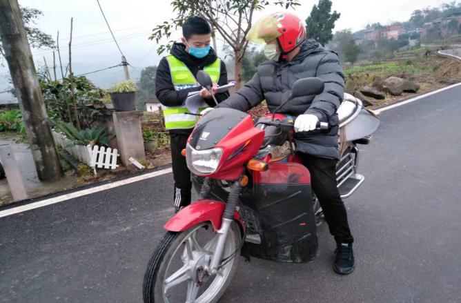 (志愿者杨建在重庆市涪陵区新妙镇弋阳村对车辆进行排查并劝返)
