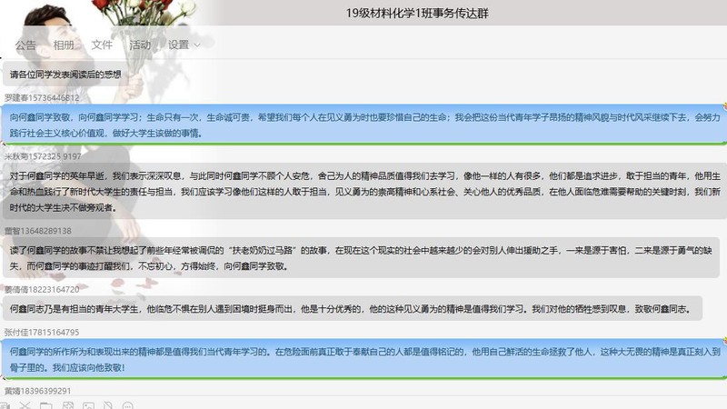 团会开始前,由各班团支书介绍此次团会的主要流程。团会伊始,各班同学于今日校园APP上进行团会打卡签到。而后,各班同学学习何鑫同学挺身而出的英勇行为。3月12日晚,何鑫同学路遇群众落水,在危急时刻,不顾个人安危,勇敢地挺身而出,在施救过程中不幸牺牲,年仅21岁。接着,由各班同学发表学习何鑫同学高尚行为的感想。其中,2019级材化一班的张付佳同学说到:“何鑫同学的所作所为和表现出来的精神都是值得我们当代青年学习的。在危险面前真正敢于奉献自己的人都是值得铭记的,他用自己鲜活的生命拯救了他人,这种大无畏的精神是真正刻入到骨子里的。我们应该向他致敬!”