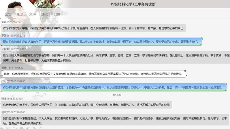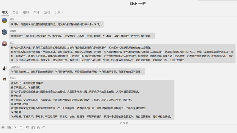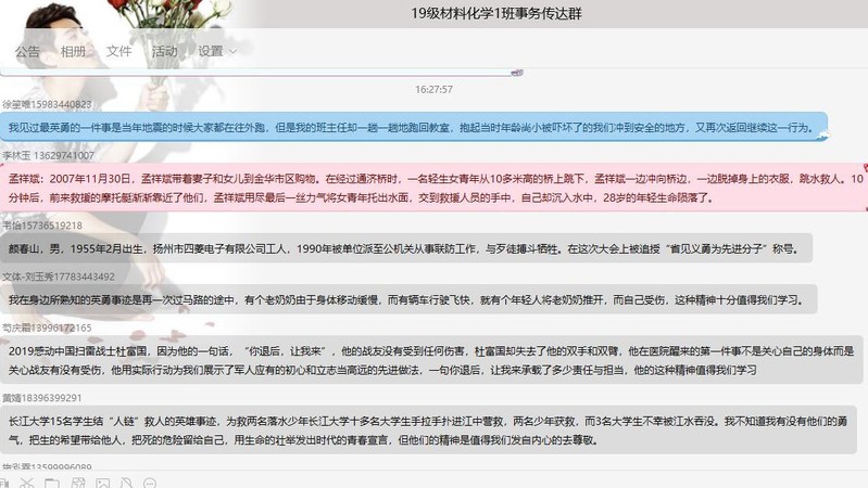 接下来,由各班同学分享身边所熟知的英勇事迹以及从他们身上学习到的精神。2019级材化一班的芶庆霜同学讲到:“2019感动中国扫雷战士杜富国,因为他的一句‘你退后,让我来’,他的战友没有受到任何伤害,杜富国却失去了他的双手和双臂,他在医院醒来的第一件事不是关心自己的身体而是关心战友有没有受伤,他是用实际行动为我们展示了军人应有的初心和立志当高远的先进做法,一句你退后,让我来承载了多少责任与担当,他的这种精神值得我们学习。”最后,由各班同学思考如何担当起青年为社会奉献的精神,作为新时代老员工应该怎么做。其中,2019级材化一班米秋菊同学谈到:“新时代的老员工是富有担当与责任感的,我们每一个老员工都应该肩负担当,满怀梦想,立志,立德,立言,立功,学习是我们本应该做的,在此基础上,应当发挥自身才能,敢于实践,不怕困难,勇于奋斗,行善做好事,为祖国繁荣昌盛添砖加瓦。