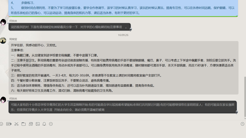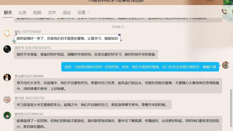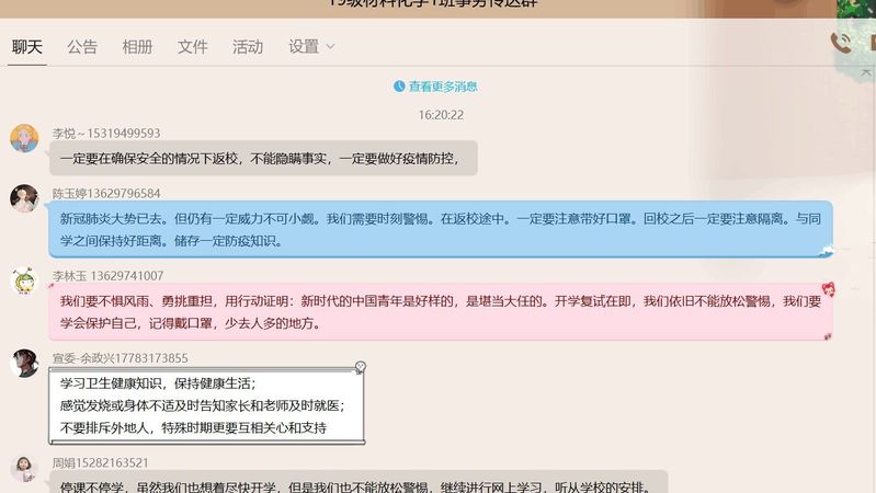 班会开始前,各班进行线上签到,以确保每一位同学能够参与到此次班会之中。班会伊始,主持班会的同学对此次班会的主题进行了简要的阐述,同时详细地说明了开学前、返校途中、开学后对公司学子的要求。随后,2019级材料科学与工程1班的周婉莹向同学们分享了关于即将开学的心情,开学在即,她表示有感动、开心,同时还夹杂着担忧;此外,她还向同学们详细的介绍了关于开学后的注意事项,总的概括为:佩戴口罩、注意卫生、寝室通风、加强锻炼、不要聚众。