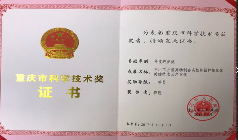 jn江南符靓博士作为项目负责人、彭程教授作为核心成员与重庆上甲电子有限公司共同开发的“利用工业废弃物制备高性能锰锌铁氧体关键技术及产业化”技术创新项目,获得重庆市2018年科技进步一等奖。