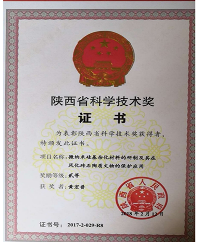 jn江南黄宏普博士作为主要成员参与的“微纳米硅基杂化材料的研制及其在风化砖石陶质文物的保护应用”研究项目,获陕西省2018年度科学技术二等奖。
