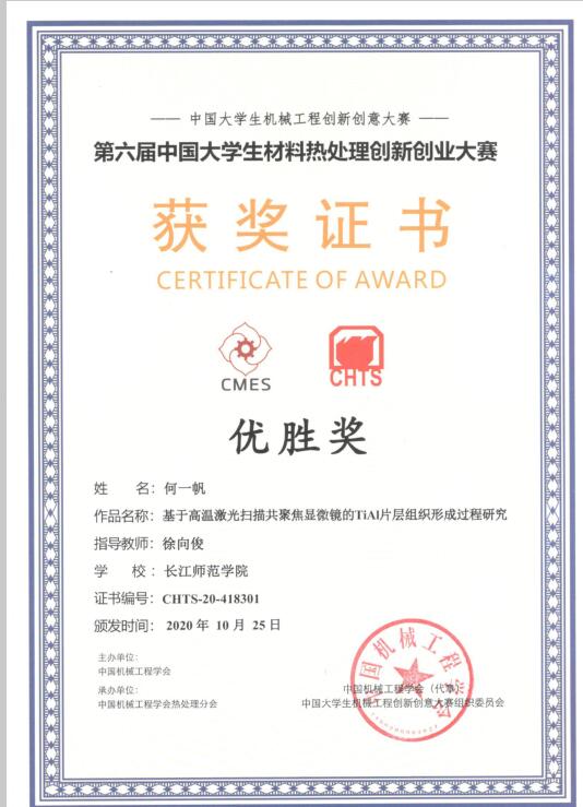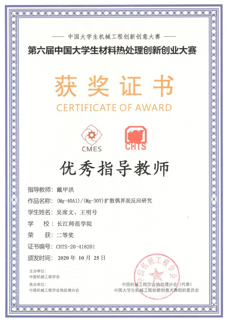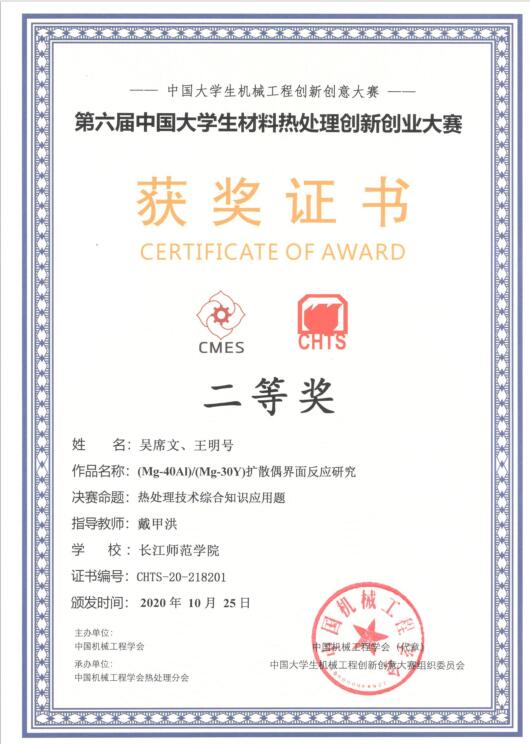 日前,由中国机械工程学会、教育部高等学校材料类教学指导委员会、教育部高等学校机械类教学指导委员会主办,中国机械工程学会热处理分会和清华大学、上海交通大学、哈尔滨工业大学、太原理工大学等6所大学共同承办的第六届中国老员工材料热处理创新创业大赛在线上举行。公司员工荣获二等奖1项、优胜奖1项,指导教师戴甲洪荣获“优秀指导教师”称号。