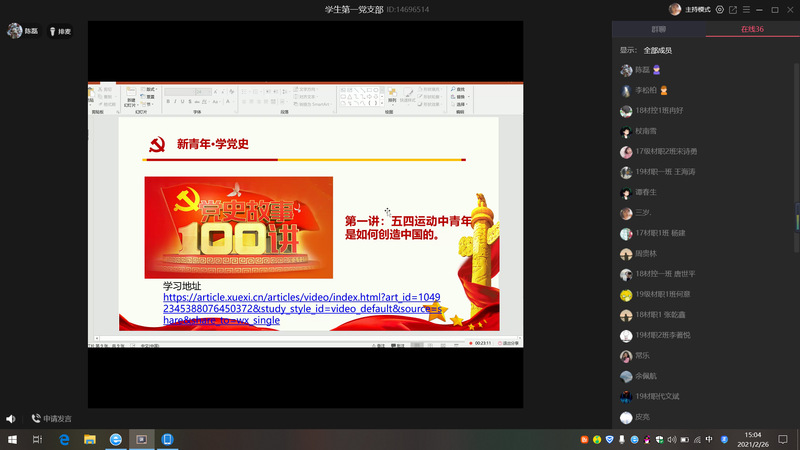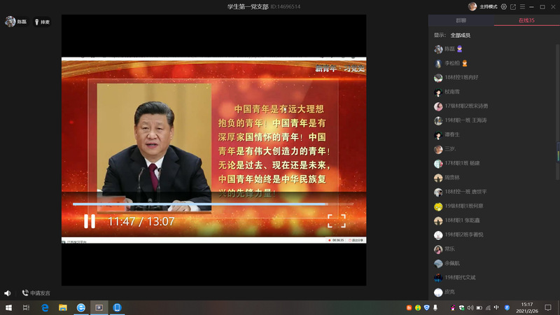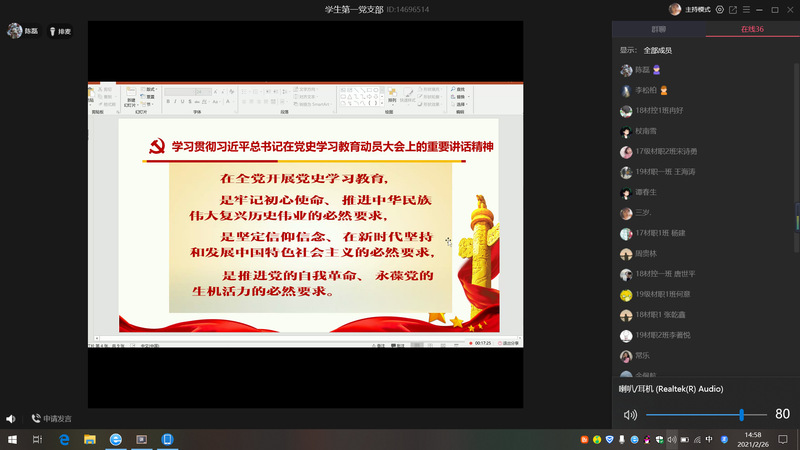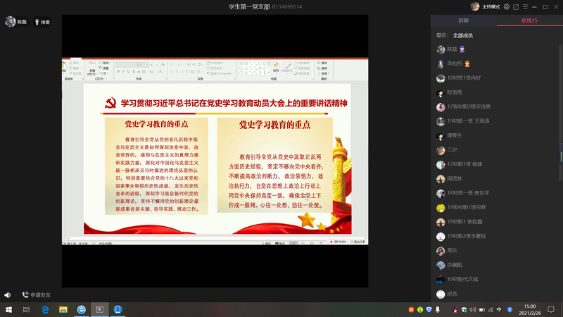 2月26日下午2时30分,员工第一党支部于线上召开了2月主题党日活动。此次主题党日活动主题为学用新思想、担当新使命、开启新征程。员工第一党支部书记书记陈磊担任此次活动的主讲人,全体员工党员和部分入党积极分子列席。