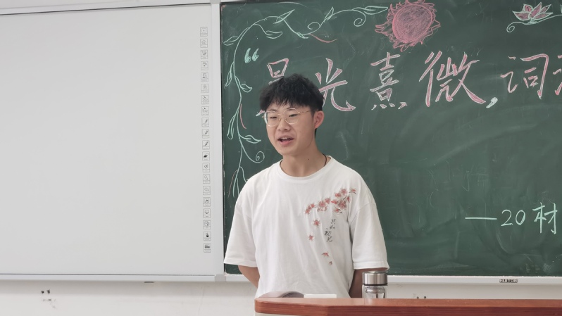 随后安志祥、宋博同学分别朗诵了《念奴娇•赤壁怀古》与《琵琶行》,真情流露。在《念奴娇•赤壁怀古》的朗诵中,公司学子将其大开大合的豪迈与悲叹展现,又在《琵琶行》中将琵琶女命运多舛的凄婉呈现。紧接着,夏乐、李乾前等同学进行了诗词背诵,他们满脸笑容,语言流畅地背诵着诗句,充分展现了公司学子活力自信的风采。