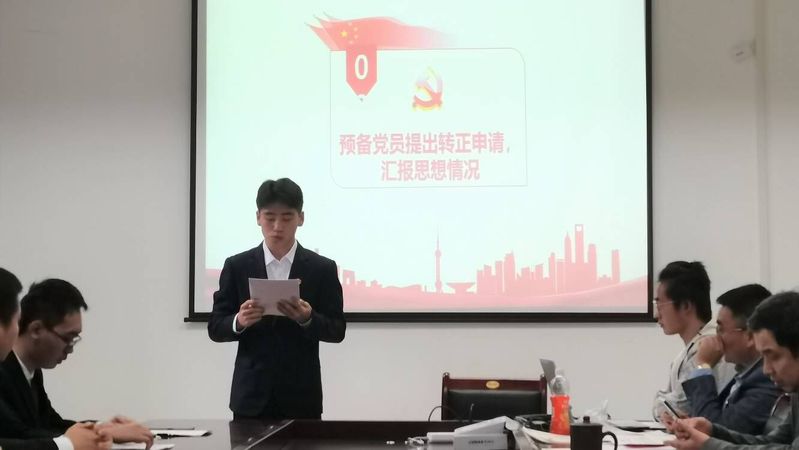 而后,朱天见同志和刘成鑫同志分别宣读了转正申请,汇报了自己在预备期间的思想认识。两位同志表示,成为一名预备党员后,在党组织的严格要求以及支部党员同志的帮助下,他们全方面了解了中国共产党的初心,并在学习,生活等各个方面严格要求自己,取得了可观的进步。思想上,他们主动加强了政治理论学习,认真反思自己的不足。最后,他们表示要用积极的态度,全力以赴的完成党交给他的每一个任务,要为共产主义奋斗终身。