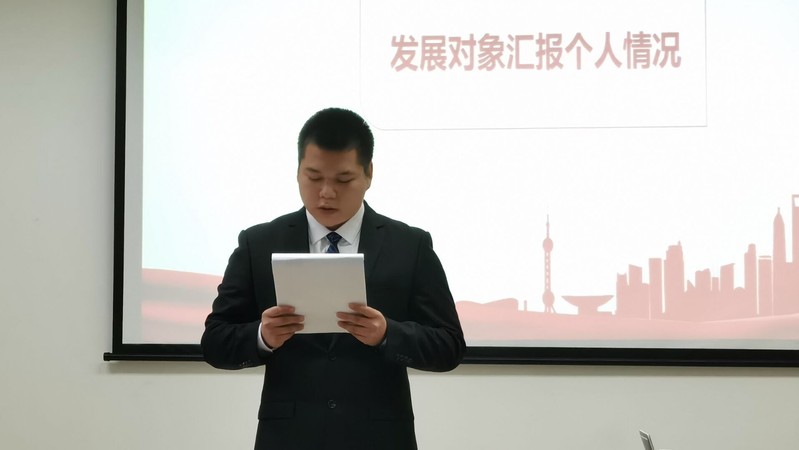 大会伊始,全体人员起立奏唱国歌。接着由待发展党员龙健行同志宣读入党志愿书和个人自传。他阐述了对党的深刻认识,并积极学习党的理论,入党动机端正,思想与党保持高度一致。作为老员工,严格要求自身,并认真履行自己的义务,积极参与活动,同时他也反思了自身的不足,表示加入党组织后,会加强对党的理论学习,积极向党组织靠拢,及在今后的学习中,勤勤恳恳,任劳任怨。