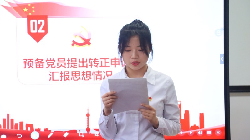 大会伊始,全体成员起立并奏唱国际歌。随后,刘远杉、李金芮、李勇、王廷择、冉洋、吴林洋和李亚辉同志分别宣读了转正申请,汇报了自己在预备期间的思想认识,并就自己在学习和工作等方面的情况做简短介绍。