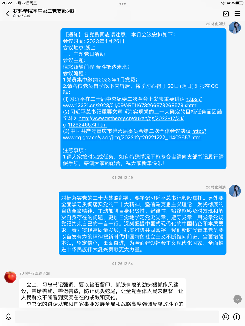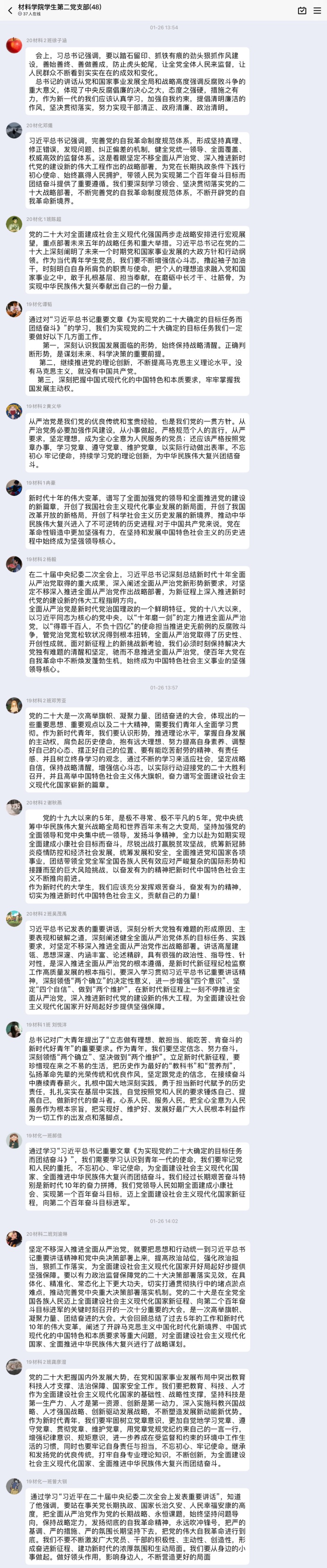 紧接着全体党员结合自学篇目交流学习心得党员同志们争先发言,表示要以学习习近平总书记在二十大报告中的讲话精神为契机振奋精神努力学习以青春朝气的姿态为党人民献礼把中国梦与个人紧密结合起来为实现中华民族伟大复兴增添强大青春力量