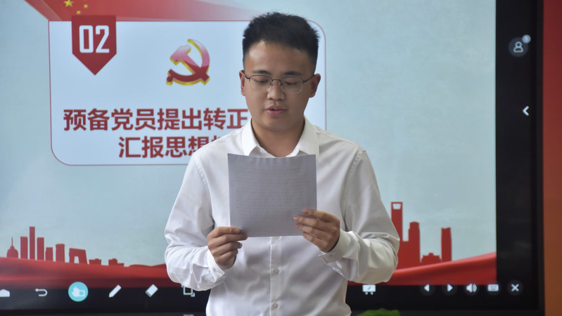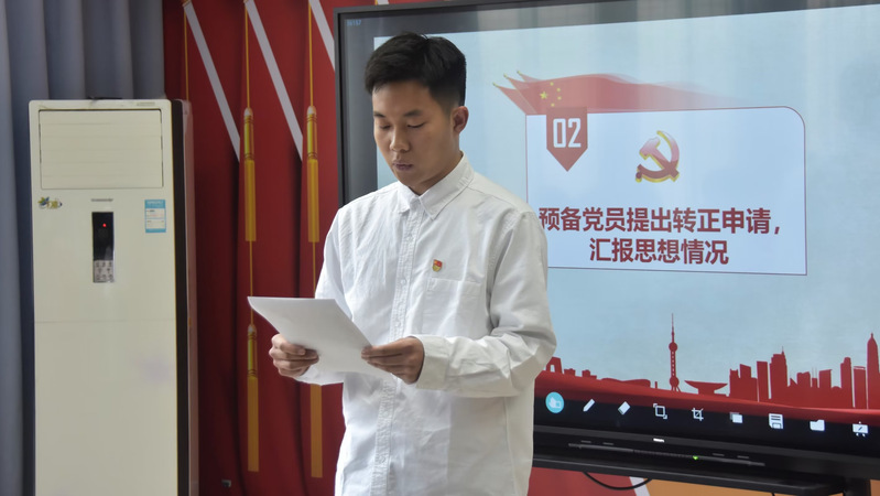 大会伊始,全体成员起立并奏唱国际歌。随后,黄载籍和胡俊杰同志分别宣读了转正申请,汇报了自己在预备期间的思想认识并客观分析了自身的优点和不足,表明了在思想政治上主动学习的态度和决心。