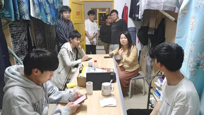 邱地老师着重与大一员工进行交流,在检查了各个宿舍的安全用电等情况后,进一步了解近期同学们的实训情况以及近期的学习情况。邱地老师说到,在实训方面的具体操作,不懂的地方可以向材职的同学多学习,即使在实训期间也不能懈怠专业课的学习,争取早日考过四六级。