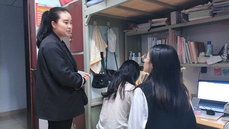 刘梦真老师在走访到大三寝室时,再次提醒同学们要遵守社区规章制度,提高个人安全意识,并耐心询问同学们的学习进度,鼓励大家积极考研、考公。