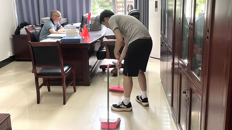 公司2023届毕业生分工合作,将学院的每一间办公室、实验室和走廊都具体分配到小组进行清扫和整理。在劳动中挥洒汗水,汗水中体验快乐。