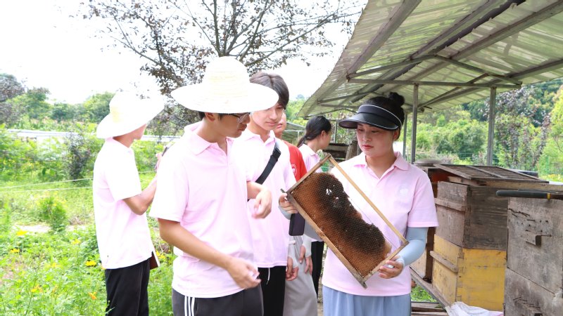 上午10点,在到达养蜂场后,志愿服务团成员与当地养殖户进行沟通,深入了解养蜂产业的规模、品种、定价、销售渠道等相关情况。通过与养蜂户的交流,志愿者们对松柏村的养蜂产业有了一定了解。通过调研得知,松柏村的养蜂场规模逐渐扩大,得到了涪陵区政府的认可和支持,村民通过成立合作社和建立良好的协作机制,提高了养蜂效益,推动了当地农业产业的发展。所生产的蜂蜜和蜂蜜制品因其品质良好且无添加剂,备受当地居民欢迎,为村民们提供了就业机会,改善了收入状况。