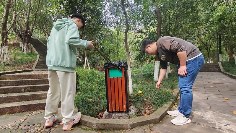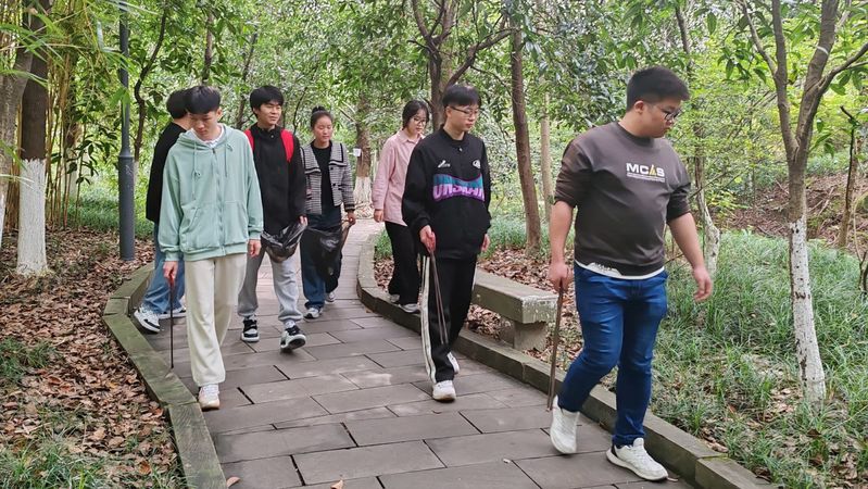 活动过程中,各小组成员带着卫生工具,分成小组在双亭山路石阶上、周边草地和树下草丛中进行垃圾清理。他们不顾脏乱,积极配合捡拾各类垃圾。大家用实际行动诠释了爱护环境、从我做起的责任担当。一个个身影穿梭在山间小路之中,大家分工协作,干劲十足,每个小组都“满载而归”。经过半个小时的不懈努力,双亭山的山间小道焕然一新。