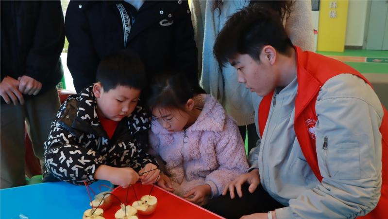 随后,志愿者们带领小朋友们进行了水果电池实验,小朋友们将材料一一分类并组装起来,再将导电片依次插在苹果上,最后连接上灯泡,看到自己手中的灯泡发出亮光,小朋友们的喜悦溢于言表。