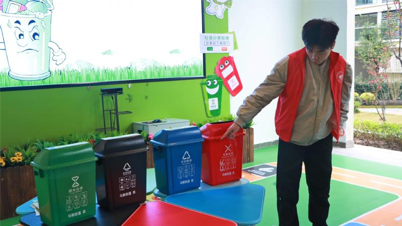 活动伊始,志愿者曹一然以PPT与动画视频相结合的方式向所有小朋友详细介绍了垃圾的四种类别,并以举例说明各类别垃圾的正确投放方式。为了让小朋友们对于垃圾分类有更深刻的认识,志愿者们还准备了一些日常生活中常见的垃圾,引导小朋友们把这些垃圾投入正确的垃圾桶中。
