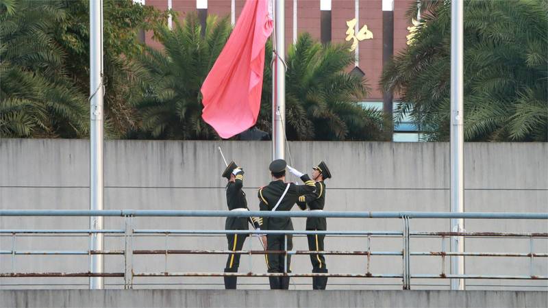 仪式第一项,学校国旗护卫队着装整齐,迈着铿锵有力的步伐,护送鲜艳的五星红旗入场。伴随着庄严的国歌声,五星红旗冉冉升起,迎风飘扬,全体师生心怀对祖国的崇高敬意向国旗行注目礼。