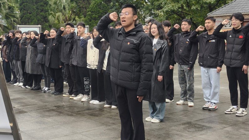最后,全体人员高举右拳,庄严宣誓。宣誓声铿锵有力、响彻云霄,大家在誓言中回溯先烈们的英勇事迹,每一个字都饱含着对革命先烈的深切敬仰与无尽怀念,每一次宣誓都彰显着同学们传承红色基因、赓续红色血脉的坚定决心。