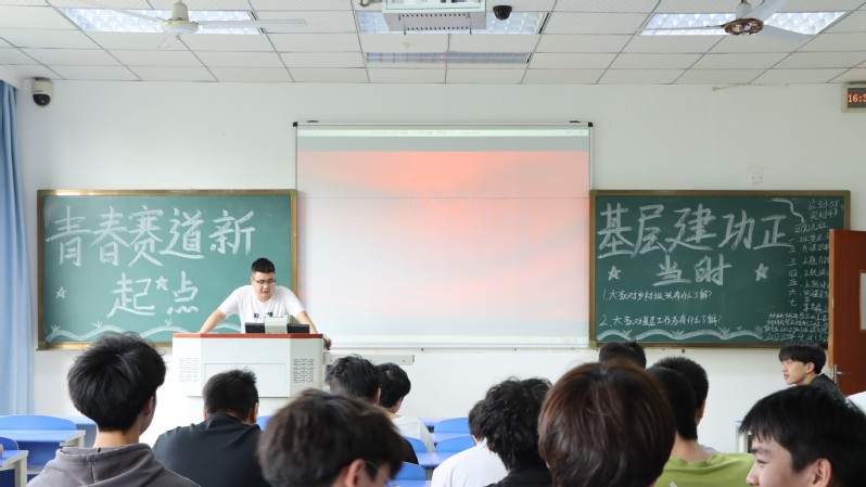 团会在各班纪检委员点名、全体齐唱团歌中拉开序幕。各班主讲人围绕乡村振兴、社区治理等内容展开深入讲解,系统介绍基层就业政策,包括录取条件、职业保障等内容,帮助同学们全面了解基层就业知识。