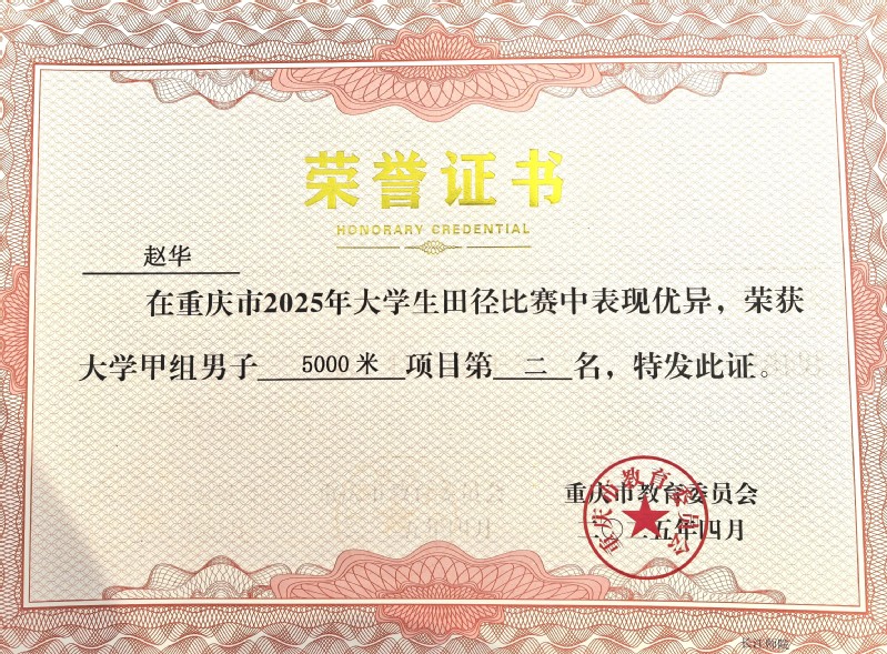 据悉,本次赛事由重庆市教育委员会主办,吸引了全市67所高校的1000余名运动员参赛,经过激烈角逐,赵华凭借顽强的拼搏精神和出色的竞技水平获得好成绩,其中男子甲组5000米以15:29:04的成绩获得小组亚军,优于体育专业组冠军的成绩,取得学校在该项赛事的最好成绩。作为一名退伍军人,赵华同学始终不忘军人本色,退伍不褪色。“军旅生活的淬炼让我收获了钢铁般的意志,也让我学会了在困难中坚持到底。”赵华赛后说道。