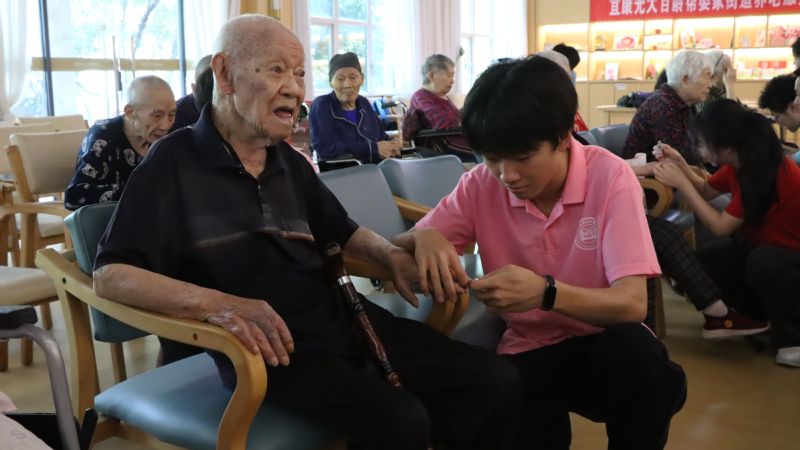 修剪指甲环节结束后,志愿者们带来精心准备的文艺表演。一首《最美的期待》旋律悠扬,寄托着对老人的美好祝愿;男生志愿者们精神抖擞,以铿锵有力的嗓音合唱《没有共产党就没有新中国》《强军战歌》,激昂旋律唤醒老人们的时代记忆,引发全场共鸣;充满青春活力的舞蹈《Super Shy》更是将气氛推向高潮,赢得现场阵阵掌声与欢笑。“看到爷爷奶奶们开心的笑容,我们觉得所有准备都值得。”一位志愿者说道。