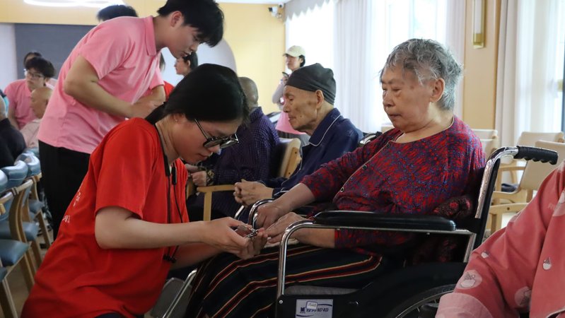 参观结束后,志愿者们开展第一项服务——为老人们修剪指甲。他们分组有序行动,手持指甲刀,耐心细致地为每位老人修剪、打磨。过程中,志愿者们与老人们亲切交谈,聆听老人们讲述过往故事,为老人们送去精神慰藉。老人们脸上洋溢着幸福的笑容,纷纷表示这种贴心的服务让他们感受到了尊重与关爱,他们感谢志愿者们在炎热的盛夏为他们带来了青春活力与温馨关怀。