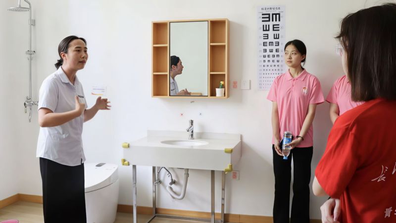 在养老服务中心经理李德凤的引导下,志愿者们参观了多功能活动区、评估室、样板间等区域。在这里,多功能活动区可供老人制作点心,评估室利用步态分析制定个性化护理方案;样板间内,智能升降床可灵活调节床头床尾高度,双层护栏为失能老人提供安全保障。尤为特别的是,房间采用“卡通标识+老地名”搭配蓝天白云墙绘的设计,以环境干预助力延缓老人认知衰退。李德凤表示,养老设施设计需兼顾照护需求与人文关怀,此次参观也让志愿者直观感受到“科技+人文”养老模式的独特魅力。