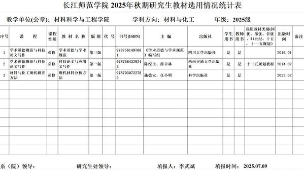 根据江南体育官方网站研究生处关于2025年秋期研究生教材选用工作要求,经过教师推审,学院评议,现将2025级学科教学(材料与化工)专业教材选用情况进行公示(见附表),公示时间:2025年7月9日至11日。公示期间,若对教材选用情况有异议,请及时向学院反映。不报真实姓名、联系方式及逾期提出异议者不予受理。